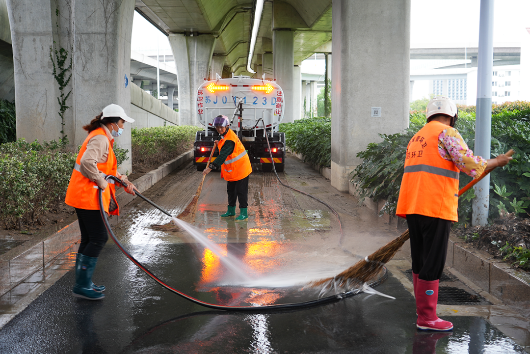 24日全天,该区环卫工人冒雨持续开展清淤排障,重点清理雨水井篦、收水口的树枝、落叶及漂浮物,并对地势低洼地段公厕化粪池全面摸排,严防满溢风险。城市道路积水基本消退后,立即开启“机械冲洗+人工保洁”模式,出动30辆洗扫车、16辆高压冲洗车、15辆小型冲洗车及700余名环卫工人全域作业。针对西环路、青年路、范公路等污染严重路段,增调力量清除淤泥、集中冲洗,快速恢复路面洁净。